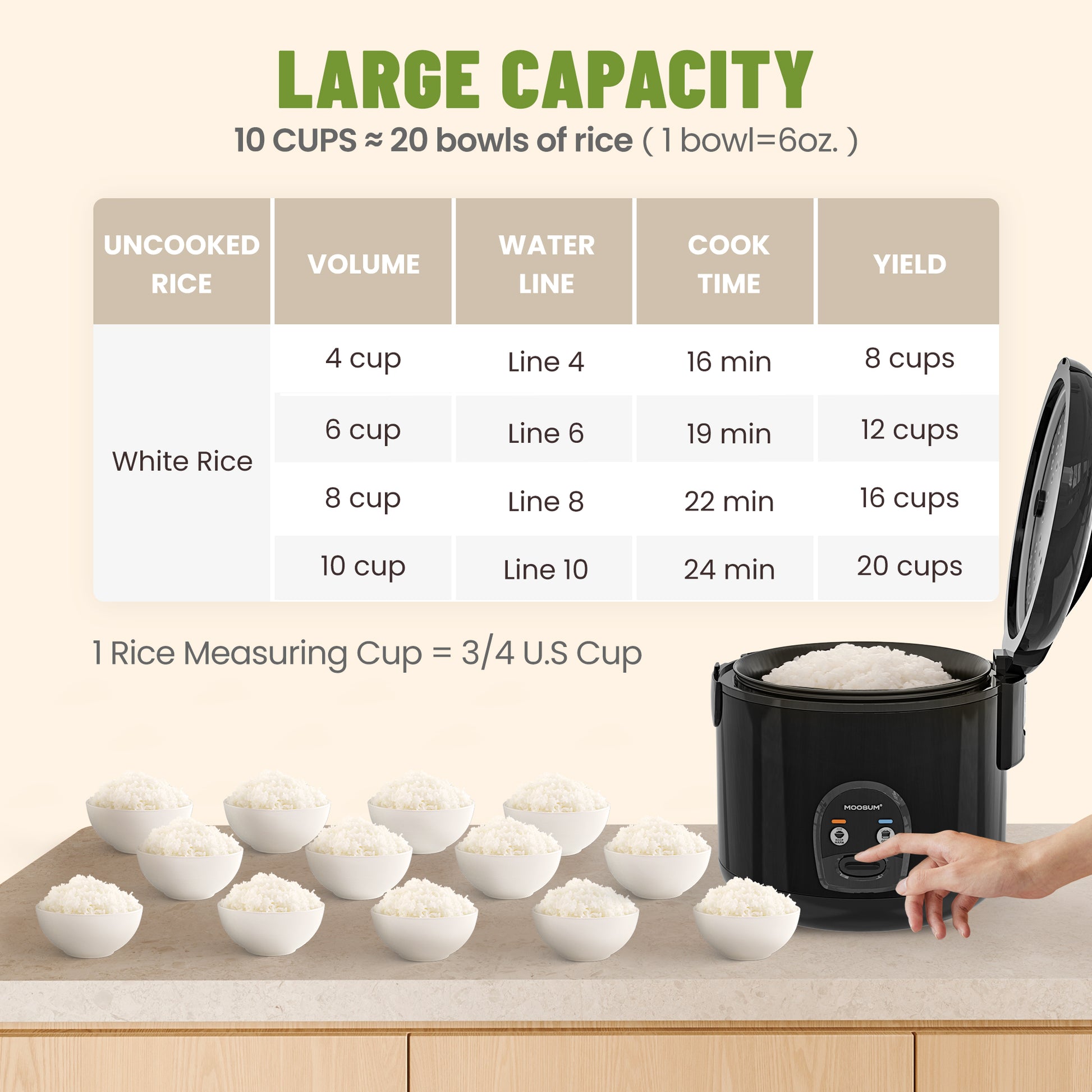 - LARGE 10-CUP CAPACITY: Ideal for 3-10 person families, cooks up to 20 cups of fluffy rice. Perfect for meal prep, gatherings, and healthy weekly planning.